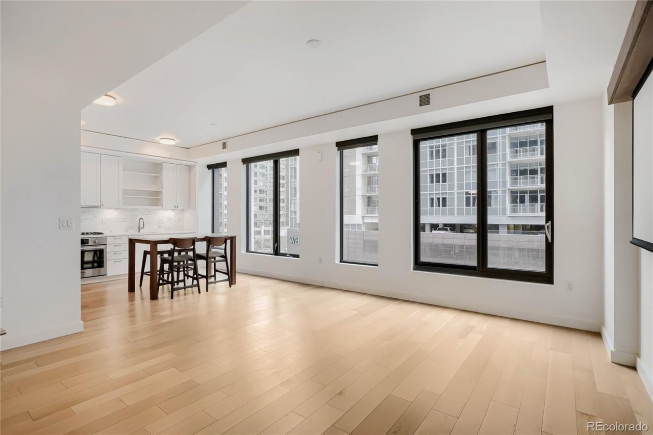 Located in the heart of Denvers vibrant Union Station neighborhood, this stunning residence places you steps from some of the citys best dining, shopping, and entertainment. Whole Foods and CVS are directly across the street, and Union Station is just outside your door, making commuting effortless with the convenient A Line train providing direct access to DIA. This spacious one-bedroom condo welcomes you with a bright, open-concept layout highlighted by a dramatic wall of windows and soaring 96 ceilings that flood the living space with natural light. The modern kitchen features upscale finishes expected in a luxury high-rise, including quartz countertops, Bosch stainless steel appliances, a five-burner gas cooktop, farmhouse sink, and elegant marble backsplash that complements the included kitchen table and chairs. A built-in desk adds a convenient workspace. Upgraded wood flooring runs throughout the living space, bedroom, and closet. The living area features a drop-down movie screen and video equipment for an in-home theater experience. The large bedroom includes a ceiling fan and connects to a generous walk-in closet. A full-size stackable washer and dryer and a spacious five-piece ensuite bathroom add convenience. The entry foyer/mudroom also includes a half bath for guests. Additional highlights include automatic blinds and a private storage unit across the hall on the fourth floor. Residents of The Coloradan enjoy exceptional amenities including retail and bike storage on the ground floor, a reception desk, mail center, business center, library, fitness center, and building managers office on Level 1.5. The fifth-floor community garden offers a peaceful retreat, while the spectacular 18th-floor clubhouse features a pool, hot tub, BBQ grills, kitchen, pool table, shuffleboard, and gathering spaces with incredible city views. A rare opportunity to enjoy luxury living in one of Denvers most sought-after locations!
