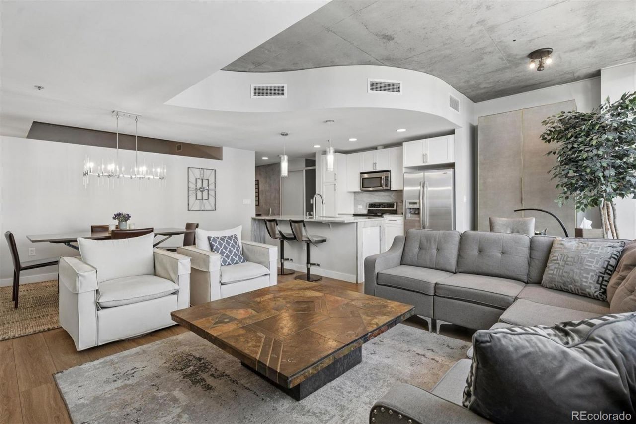 A study in light, line, and city rhythm?this elevated residence at Spire invites you to live at the intersection of design and downtown energy. Framed by floor-to-ceiling glass, the home captures an ever-changing canvas of skyline and mountain views, where sunrise softens the city and twilight ignites it. A gracious entry unfolds into an open composition of living, dining, and kitchen spaces?effortless, modern, and artfully connected. The kitchen is both functional and sculptural, with quartzite surfaces, sleek cabinetry, and a generous island designed for gathering. High ceilings and refined finishes create a sense of volume and calm, while thoughtful upgrades bring a fresh, turnkey ease to daily living. A private balcony extends the living experience outdoors, offering a front-row seat to Denvers light and motion. The layout is as intentional as it is beautiful, with two ensuite bedrooms positioned for privacy?each a quiet retreat above the citys pulse. The generous owners retreat enjoys city and mountain views, a 5-piece ensuite bath, large ELFA closet, stackable washer/dryer, and ample space for a king-sized bed. The guest bedroom with a Murphy bed to simplify guest visits easily doubles as a home office. Spire itself is a statement in sustainable luxury?LEED-certified and rich with amenities that elevate everyday life. Over 35,000 square feet of amenity space with resort-style rooftop pools and hot tub, state-of-the-art fitness and wellness spaces, curated lounges, fire pits, grilling areas, theater room, furnished guest suites, and concierge service create a seamless blend of comfort and sophistication. Step outside and the city becomes your landscape. With a Walk Score of 97, light rail just across the street, and the Denver Performing Arts Complex, Larimer Square, and downtowns best dining and culture moments away, this is true urban immersion. This is more than a residence?its a refined, artful way of living.